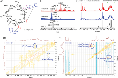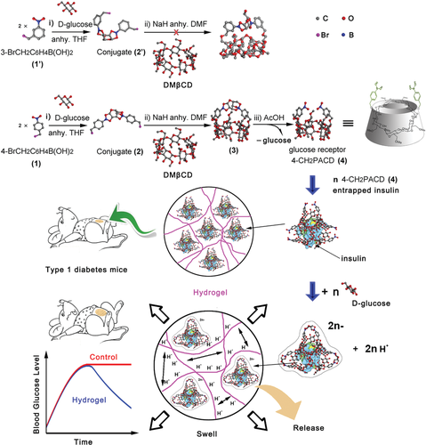 雙齒 β-CD 通過三個簡單的反應(yīng)很容易合成,從 DMβCD 和對(溴甲基)苯基硼酸開始。雙齒β-CD的形成過程被發(fā)現(xiàn)是尺寸選擇性的,因為從間(溴甲基)苯基硼酸試劑中,不能提供雙齒β-CD衍生物。雙齒 β-CD(即 4-CH2PACD)包含葡萄糖狹縫,并顯示出與 D-葡萄糖的高效特異性結(jié)合。合成的 4-CH2PACD 被摻雜到 PAAm 水凝膠中,賦予水凝膠對 D-葡萄糖的特異性反應(yīng)。具體而言,當凝膠在 D-葡萄糖溶液中平衡時,水凝膠的膨脹是可見的,而在 D-葡萄糖異構(gòu)體(如 D-果糖和 D-半乳糖)溶液中則收縮。發(fā)現(xiàn)這種特征有利于自我調(diào)節(jié)的特定葡萄糖響應(yīng)性胰島素釋放,因為溶液中高濃度的 D-葡萄糖會導(dǎo)致凝膠膨脹并增加網(wǎng)格尺寸。體內(nèi)試驗表明,在 T1DM 中預(yù)加載雙齒 β-CD 和短活性胰島素的 PAAm 水凝膠能夠?qū)崿F(xiàn)長期持續(xù)的血糖控制。預(yù)計這種簡便的合成方法將為雙齒 β-CD 作為各種重要生物化合物或代謝物的受體的合成打開一扇新的大門。考慮到 β-CD 與許多生物或藥物活性化合物之間的多功能主客體內(nèi)含物,以及雙齒 β-CD 與靶向生物分子之間的特定相互作用,為 DSGTIR 開發(fā)了一種新機制。
