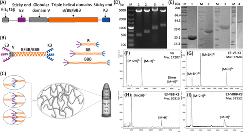 圖 1. 蛋白質的設計策略和驗證。測試了三種設計:E3-VB-K3、E3-VBB-K3 和 E3-VBBB-K3。蛋白質的 (A) 序列和 (B) 二級結構的示意圖。(C) 提出的分子間關聯(lián)和自組裝機制。凝膠電泳表征 (D) 用 NcoI 和 BamHI 酶消化重組質粒后核苷酸片段的長度和 (E) 蛋白質的分子量。(F-I) 基質輔助激光解吸電離飛行時間 (MALDI-TOF) 質譜法表征蛋白質的分子量。