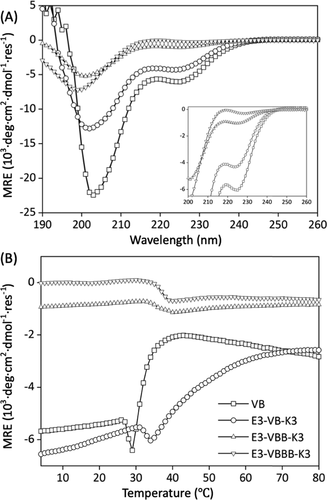 圖 3. 蛋白質結構和穩(wěn)定性。(A) CD 波長掃描和 (B) VB、E3-VB-K3、E3-VBB-K3 和 E3-VBBB-K3 在 10 mM 磷酸鹽緩沖液 (pH 7.4) 中 1 mg/mL 的熱變性曲線。
