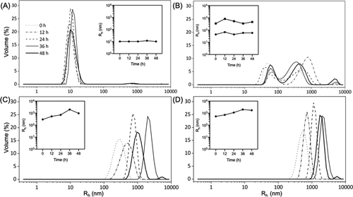 圖 5. 粒度分布。設計的膠原蛋白 (A) VB、(B) E3-VB-K3、(C) E3-VBB-K3 和 (D) E3-VBBB-的流體動力學半徑(Rh)分布的動態(tài)光散射 (DLS) 測量 K3 超過 48 小時。將樣品在 10 mM 磷酸鹽緩沖液中保持在 4 °C,濃度約為 1 mg/mL(pH 7.4)。每個子圖的插圖顯示主要 Rh 峰(> 5% 體積強度)隨時間的變化。在所有子圖中,不同時間的Rh分布曲線如右圖所示。