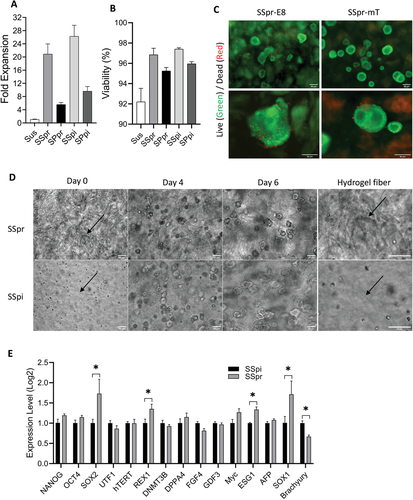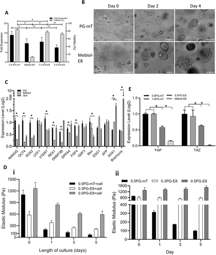 圖4 與基于 3D PEG 的水凝膠相比,3D PGmatrix 水凝膠中的 hiPSC 顯示出優異的特性。A) ASC-hiPSCs 在含有 mTESR1 (0.5 PG-mT) 的 3D PGmatrix (0.5%) 中比在含有 E8 培養基 (Mebiol-E8) 的 3D Mebiol 凝膠中生長得更好。