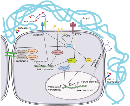細胞通過分泌蛋白酶作為基質降解酶和 ECM 蛋白來積極改變周圍的 3D 微環境。這些修飾通過細胞間接觸(E-鈣粘蛋白)和旁分泌信號分子促進細胞遷移和信號傳導。除了可溶性因子信號外,來自細胞-基質或細胞-細胞粘附的物理(機械強度)線索影響肌動蛋白-肌球蛋白細胞骨架并通過 Hippo 途徑發送信號,最終影響機械敏感 YAP/TAZ 基因的表達,以調節和維持 hiPSC 的增殖和多能性,以實現 hiPSC 的長期維持。GPCRs——G蛋白偶聯受體和RTKs——受體酪氨酸激酶。