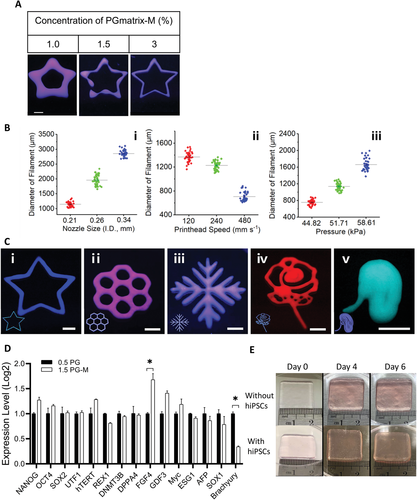 圖5 PGmatrix-M 作為生物墨水的可印刷性和 hiPSCs 性能。A) PGmatrix-M 在不同濃度下的打印分辨率。B) i) 噴嘴尺寸、ii) 打印頭移動速度和 iii) 打印壓力對 PGmatrix-M bioink 可打印性的影響。C)不同圖案的生物打印 PGmatrix-M 結構 (3%)。比例尺。5 毫米。D)在 1.5% PGmatrix-M (1.5 PG-M) 中培養的 ASC-hiPSC 與在 0.5% PGmatrix (0.5 PG) 中培養的那些相比,在多能性相關基因中沒有表現出主要的表達模式差異。E) PGmatrix-M 構建體在有或沒有 hiPSCs 的情況下保持穩定至少 6 天(在第 6 天之前破壞構建體以收集細胞以進行進一步分析)。