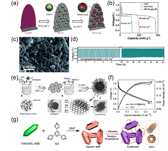 圖4. (a, b) 柔性碳布上垂直NC-Co₃O₄陣列的制備工藝和電壓-容量曲線(固態鋅-空氣電池);(c, d) Co₉S₈@TDC-900催化劑的掃描電鏡圖像和長期充放電循環圖;(e, f) Mo-N/C@MoS₂催化劑的合成示意圖及V-I極化和功率密度曲線;(g) FeNiP/NCH催化劑制備工藝流程圖。
