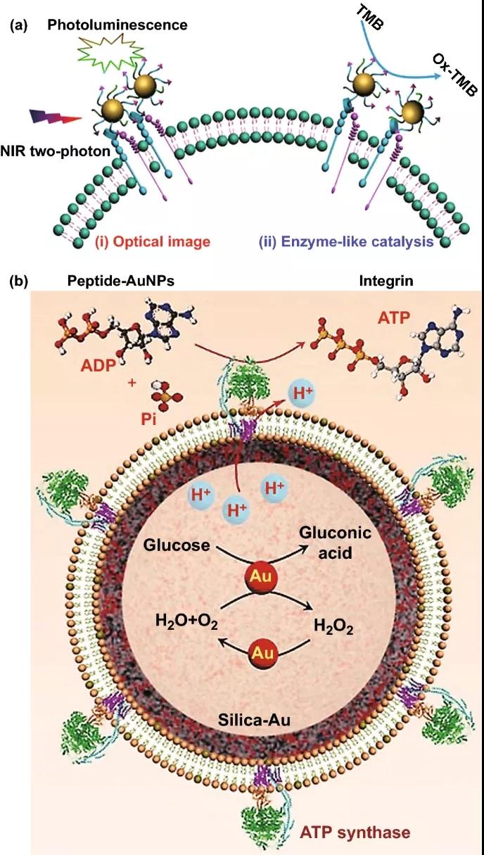 圖12. 傳統的納米酶定義結合了金納米粒子和金屬離子作為催化劑。(a) AuNP結合單分子膜絡合Cd2⁺和Cu2⁺離子對HPNP的催化裂解。(b) Ru催化劑嵌入AuNPs保護層。