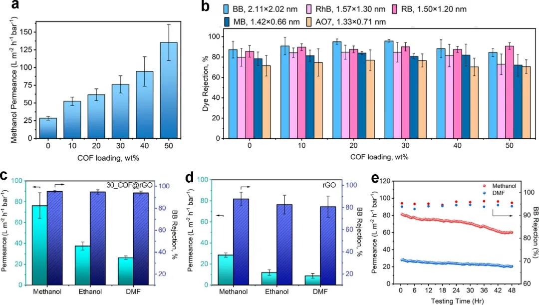 插入二維COF后的雜化薄膜在不同有機溶劑體系下的性能均高于未插入COF的純rGO薄膜。
