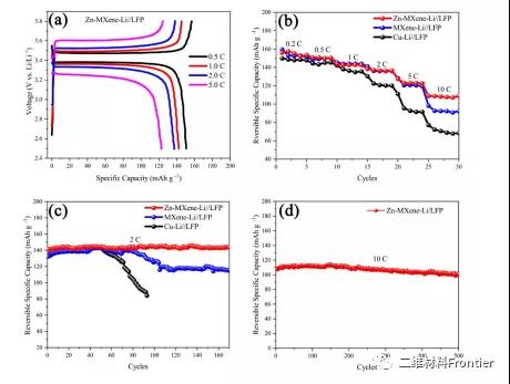 圖4. a) Zn-MXene-Li/LFP 電池在不同倍率 (0.5- 5.0 C) 下的選定放電-充電曲線。b) Zn-MXene-Li//LFP、MXene-Li//LFP 以及 Cu-Li//LFP 電池的倍率能力,即使在 10 C 下也表現(xiàn)出良好的倍率能力。c) Zn-MXene-Li 的循環(huán)性能 //LFP、MXene-Li//LFP 以及 2 C 下的 Cu-Li//LFP 電池。d) Zn-MXeneLi//LFP 電池在 10 C 下的長循環(huán)性能。(C=170 mA g -1 )