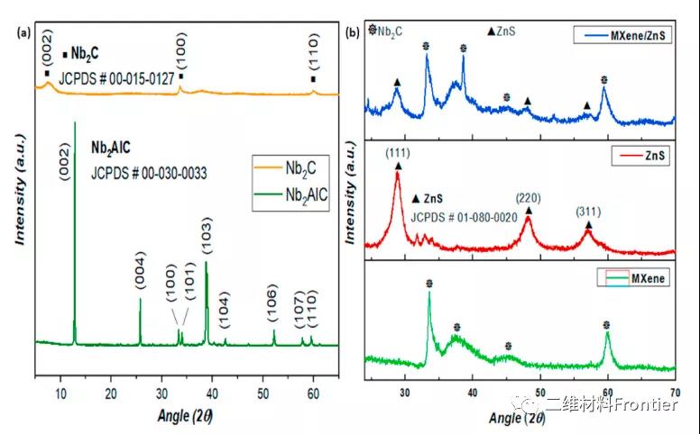 圖2.(a)MXene與MAX相相比的XRD模式,(b)MXene-ZnS納米復合材料與反應物的XRD平行。