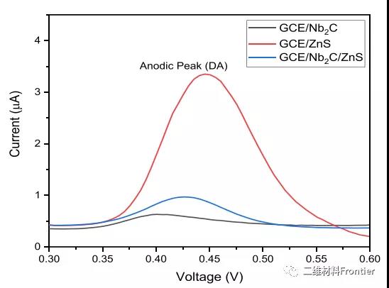 在0.1M磷酸鹽緩沖鹽(PBS)(pH=3)中,通過DPV以50mv-1掃描速率觀察其在不同修飾GCE電極上電化學檢測DA。GCE通過使用三個樣本進行了修改。Nb2C MXene、硫化鋅和Nb2C /ZnS納米復合材料。為此目的選擇的電位窗口為0.3~0.6V,最大峰值電流為0.40V~0.435V。