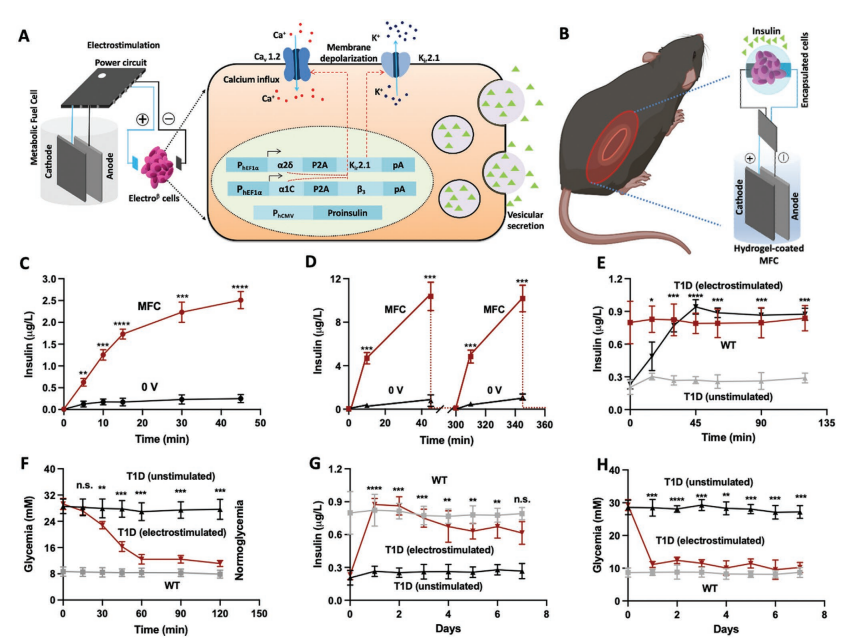 目前可用的生物電子設(shè)備消耗太多的能量,無法在可充電電池上連續(xù)運(yùn)行,而且通常是無線供電,伴隨著可靠性、便利性和移動(dòng)性等問題。因此,一種在生理?xiàng)l件下工作的強(qiáng)大的、自給自足的、可植入的發(fā)電機(jī)的可用性將對許多應(yīng)用產(chǎn)生革命性的影響,從驅(qū)動(dòng)生物電子植入物和假體到編程細(xì)胞行為和患者的新陳代謝。在這里,利用一種新的含銅、導(dǎo)電性調(diào)諧的3D碳納米管復(fù)合材料,設(shè)計(jì)了一種可植入的血糖代謝燃料電池,該電池可以連續(xù)監(jiān)測血糖水平,在高血糖期間將多余的葡萄糖轉(zhuǎn)化為電能,并產(chǎn)生足夠的能量(0.7 mW/cm-2, 0.9 V, 50 mM葡萄糖)來驅(qū)動(dòng)工程細(xì)胞泡狀胰島素釋放的光和電遺傳調(diào)節(jié)。研究表明,在I型糖尿病的實(shí)驗(yàn)?zāi)P椭,通過結(jié)合電代謝轉(zhuǎn)化和胰島素釋放介導(dǎo)的細(xì)胞消耗,將血糖監(jiān)測與消除過量血糖相結(jié)合,使代謝燃料電池能夠以自動(dòng)、自給自足和閉環(huán)的方式恢復(fù)血糖穩(wěn)態(tài)。