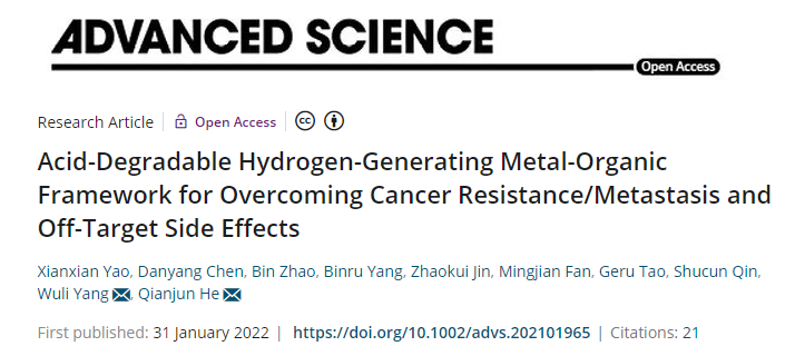 Adv. Sci. 2022:酸降解產氫MOF材料克服癌癥耐藥/轉移和脫靶副作用