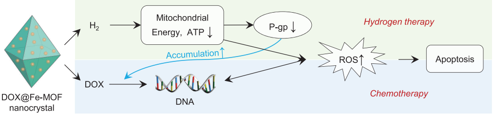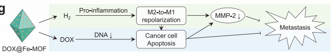 (圖1 從DOX@Fe-MOF納米晶體中釋放酸反應性氫/藥物以克服癌癥耐藥/轉移的示意圖)