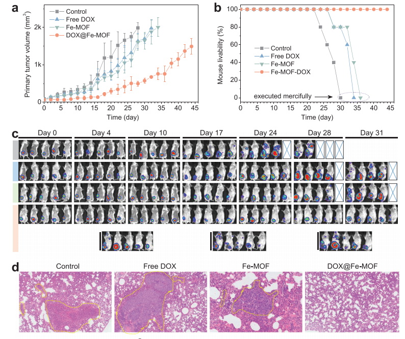 (圖6 DOX@Fe-MOF納米藥物對原發性乳腺腫瘤生長和肺轉移的抑制作用)