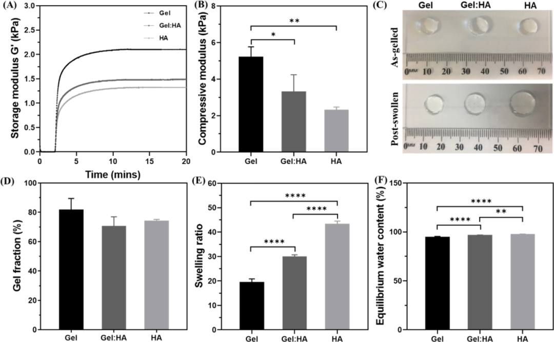 首先,作者設(shè)計(jì)了三種不同的含有硫醇功能化PEG (PEG-(SH)2)的水凝膠,并與降冰片功能化明膠(Gel-NB)或降冰片功能化透明質(zhì)酸(HA-NB)或Gel-NB和HA-NB的混合凝膠混合使用。水凝膠的光交聯(lián)動(dòng)力學(xué)通過原位光流變學(xué)進(jìn)行監(jiān)測(cè),結(jié)果顯示,無論水凝膠組成如何,光暴露的幾秒鐘內(nèi)就能迅速形成凝膠。從壓縮測(cè)試中得到的應(yīng)力-應(yīng)變曲線可知,Gel、Gel:HA和HA水凝膠的壓縮模量分別為5.2、3.3和2.3 kPa,與存儲(chǔ)模量的變化趨勢(shì)相同。這些數(shù)據(jù)表明,水凝膠的硬度呈現(xiàn)出Gel>Gel:HA> HA的趨勢(shì)。由于高含水量的水凝膠往往比含水量少的水凝膠更軟,HA和明膠親水性的差異也可能導(dǎo)致由它們形成的水凝膠的力學(xué)性能的差異(圖2)。