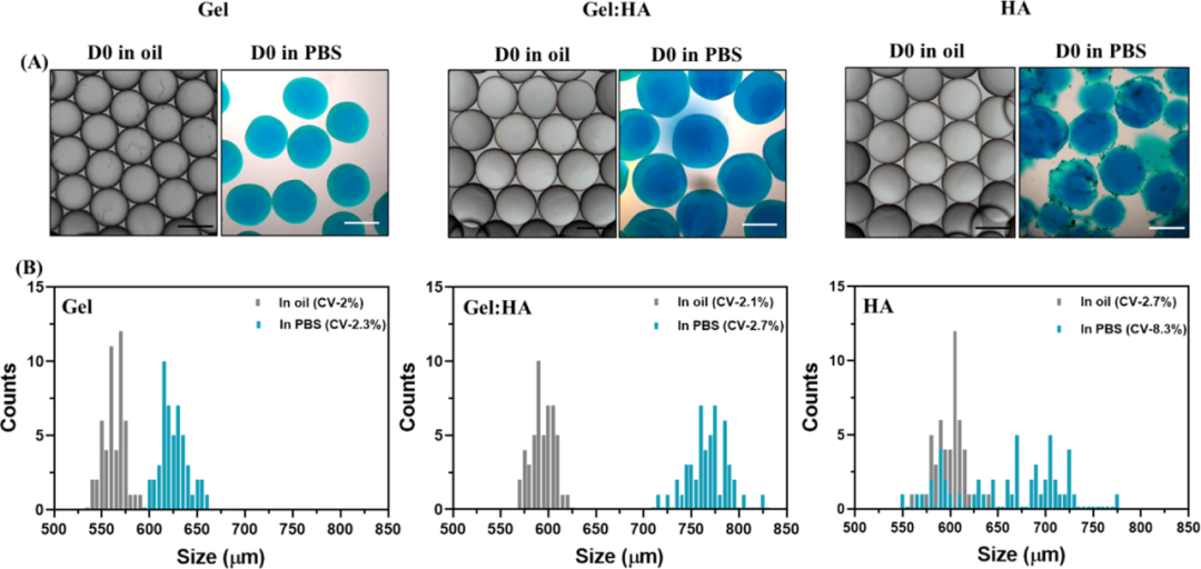 接下來,作者使用基于移液管的微流體技術(shù)合成Gel、Gel:HA和HA微凝膠。對(duì)微凝膠的大小和分布進(jìn)行了表征。Gel:HA微凝膠與在塊狀水凝膠中觀察到的溶脹一致,都?xì)w因于HA的高親水性(圖3)。