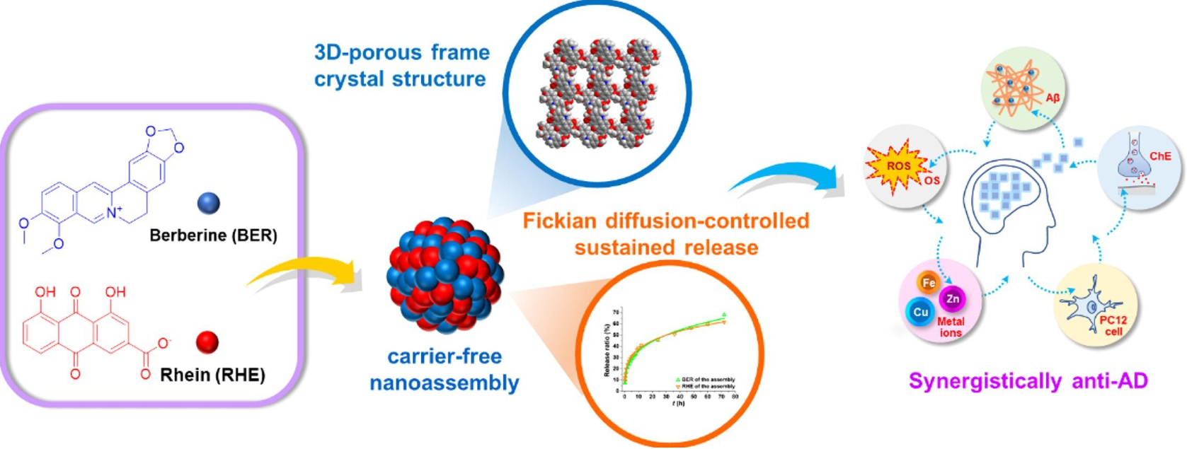 AD是一種由多種因素引起的破壞性神經退行性疾病。單靶點藥物治療AD 的療效有限。因此,多目標干預策略具有巨大的潛力。中藥多以復方形式使用,具有多藥學行為。黃連和大黃是治療AD常用的中藥對聯藥物。在這項研究中,具有3D多孔框架晶體結構的新型無載體納米組裝體由黃連和大黃的主要活性成分小檗堿(BER) 和大黃酸 (RHE) 的超分子自組裝配制而成。結合光譜數據和單晶結構,闡明了自組裝過程以靜電相互作用和π-π堆積為主。體外釋放特性、膽堿酯酶 (ChE) 抑制、β-淀粉樣蛋白 (Aβ) 聚集調節、自由基消除、金屬離子螯合和細胞毒性測定表明,獲得的 BER-RHE 組件具有 Fickian 擴散控制的緩釋能力、協同生物活性幾乎沒有神經毒性。此外,體內活性氧(ROS)水平評估表明,該組裝可以減少秀麗隱桿線蟲(C. elegans)細胞內ROS的積累。同時,BER-RHE 組件由于其卓越的3D多孔框架也可用作新型潛在的藥物輸送載體。這種通過超分子自組裝構建無載體納米組裝微觀結構的綠色簡便策略可能為 AD 多靶點治療的開發和新型藥物遞送系統的設計提供靈感。