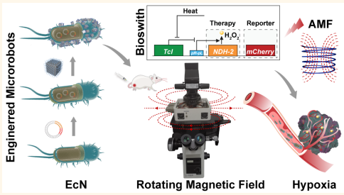 生物雜交微機(jī)器人,它集成了磁性、熱性和缺氧敏感性和一種內(nèi)部熒光蛋白,作為靶向癌癥治療的熱信號(hào)和定位信號(hào)的雙重報(bào)告基因。