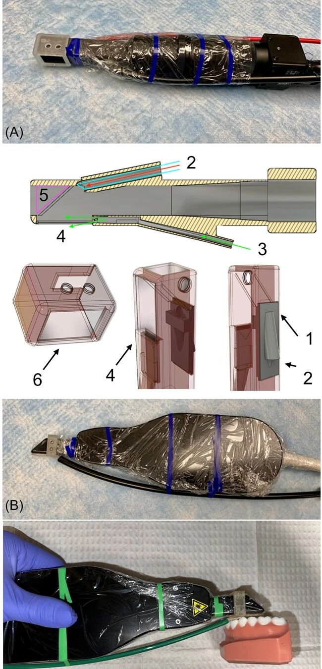本研究采用了SWIR反射成像裝置以及CP-OCT裝置。圖1A中示出了完全組裝的SWIR反射成像裝置的圖像。該裝置由三個3D打印的可高壓滅菌附件、一個用于傳輸SWIR光的直徑為1 mm的光纖、一個空氣噴嘴、一個由兩個透鏡組成的組件以及一個連接到微型InGaAs相機的可調節光圈組成。本研究使用的CP-OCT系統是從Santec購買的型號IVS-3000-CP。CP-OCT手柄的圖像如圖1B所示,它已被用于多種體內齲齒成像研究。