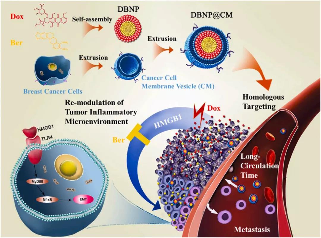 (1) Berberine (Ber) is a clinically approved alkaloid that has been proven to be a modulator of HMGB1-TLR4, which can promote breast cancer metastasis in vivo and in vitro. First, the experiment hypothesized that the combined use of Dox and Ber is beneficial for breast cancer chemotherapy, and designed a self-assembled nano-drug (DBNP) composed of Dox and Ber.